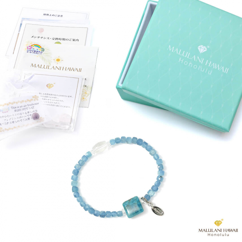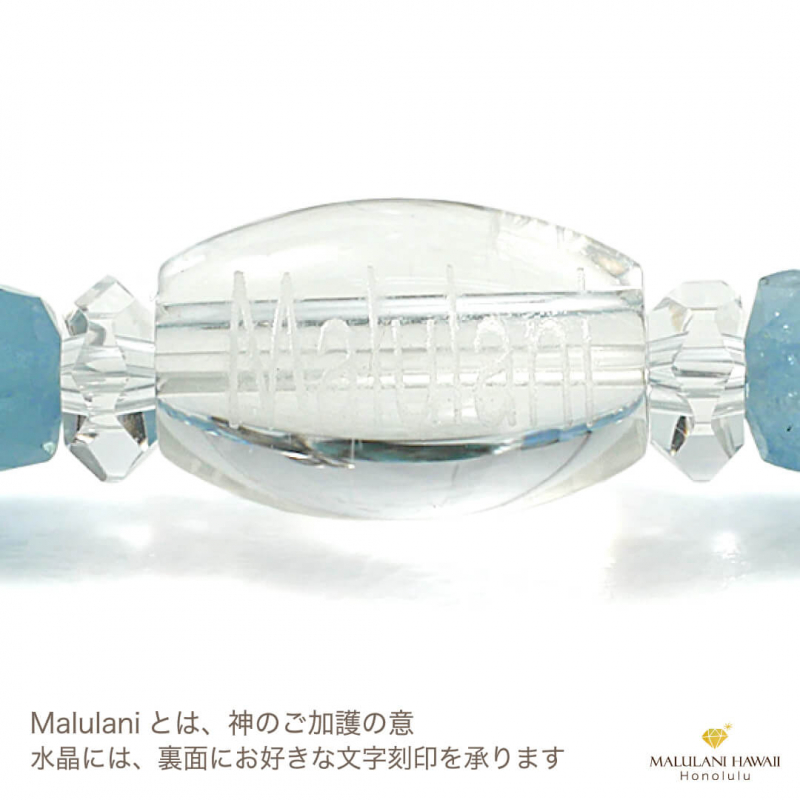 水晶とオリジナルチャームには、ハワイ語で「神に護られた」という意味を持つ「malulani」と刻印。