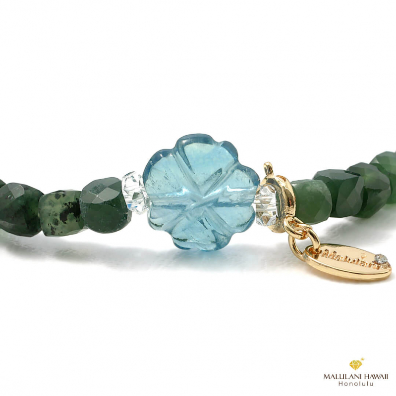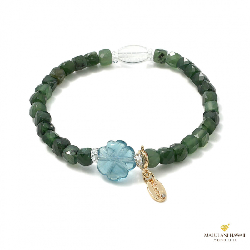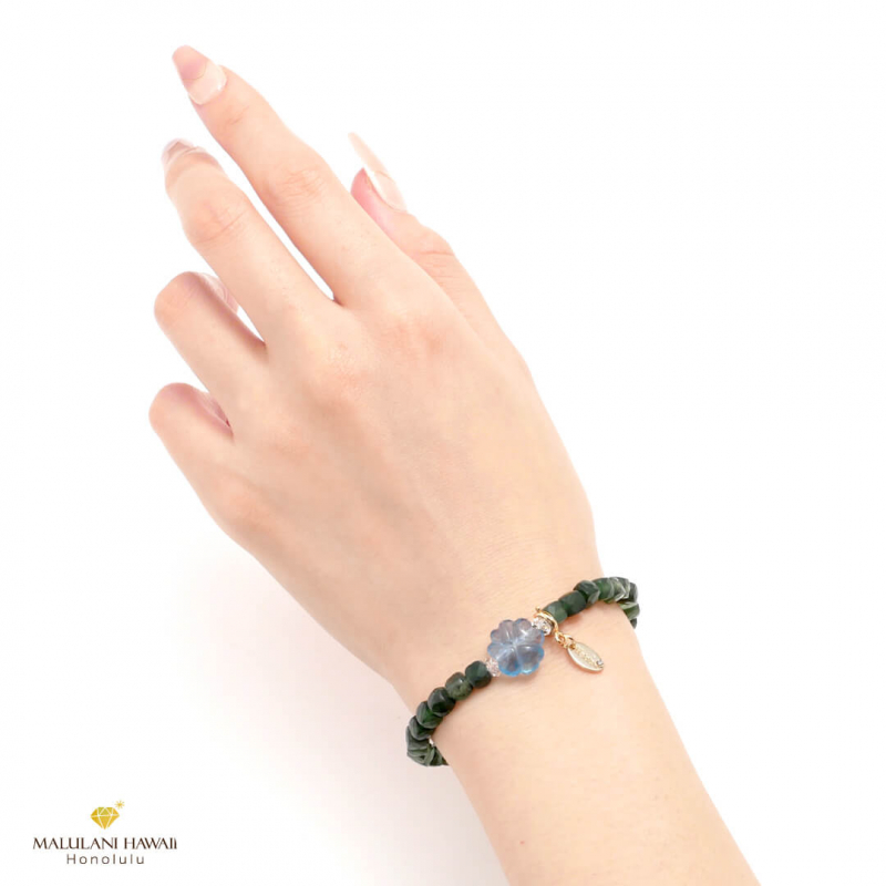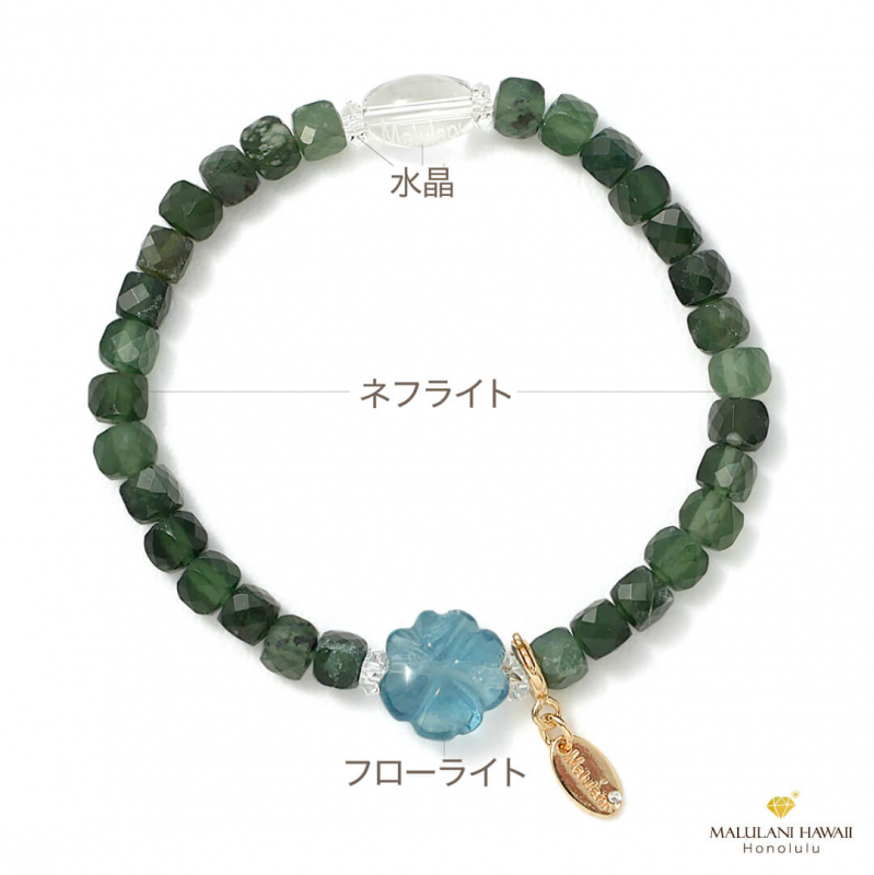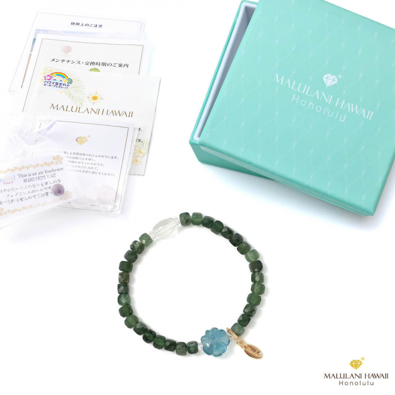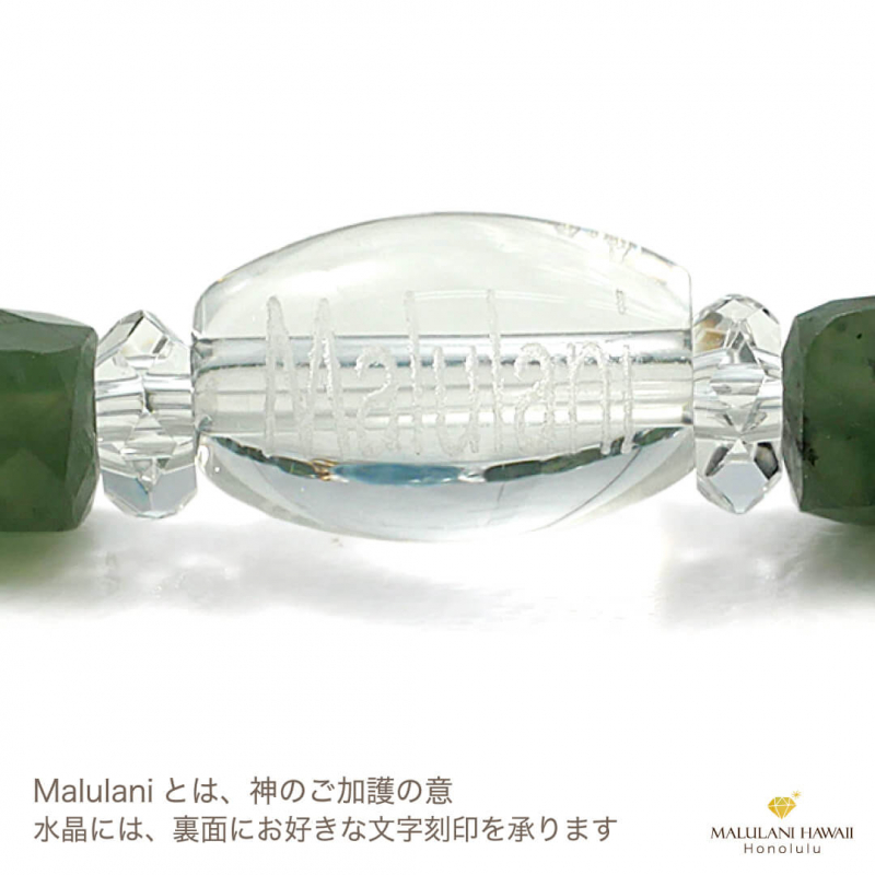 水晶とオリジナルチャームには、ハワイ語で「神に護られた」という意味を持つ「malulani」と刻印。