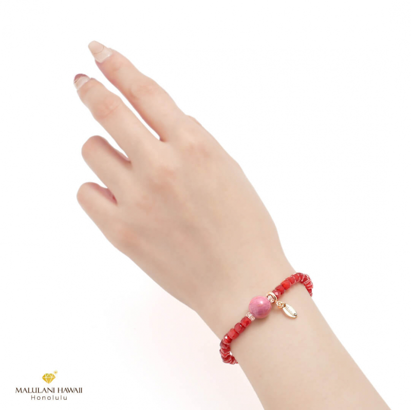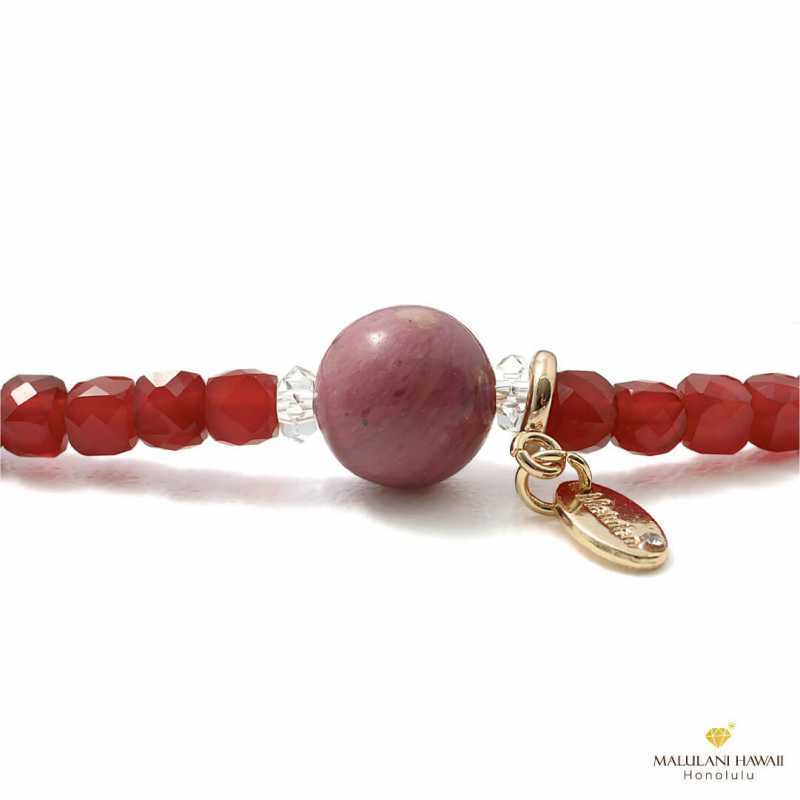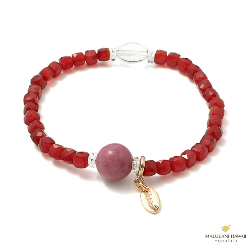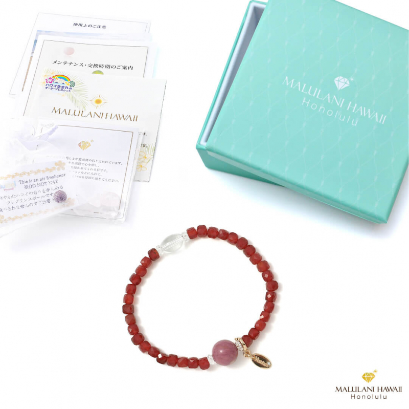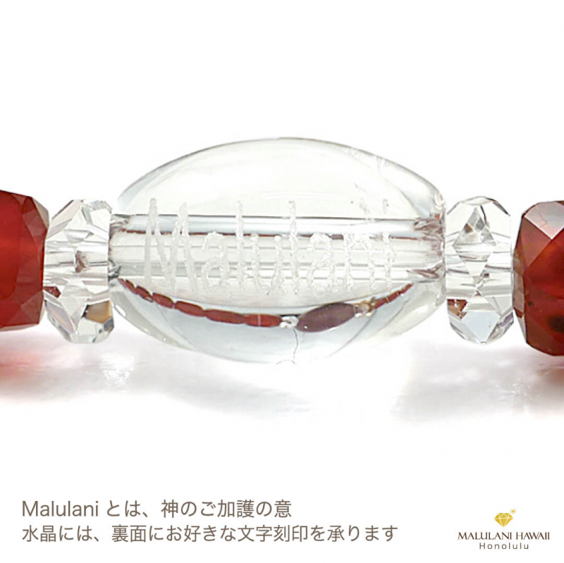 水晶とオリジナルチャームには、ハワイ語で「神に護られた」という意味を持つ「malulani」と刻印。