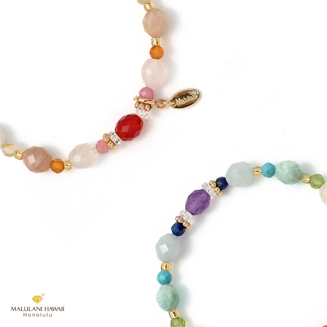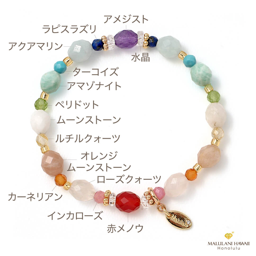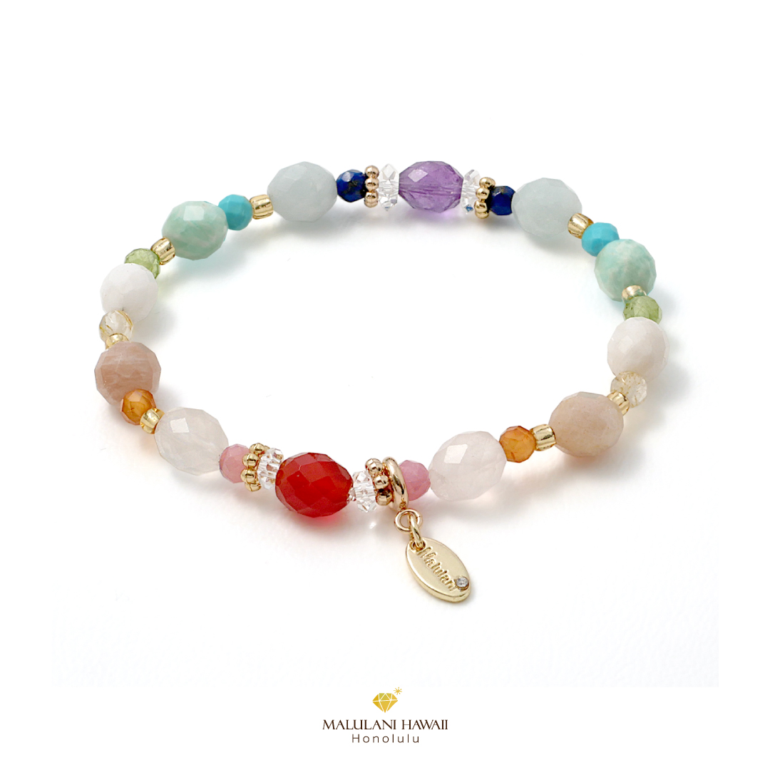 レインボーカラーの色彩豊かな天然石が、優しく調和するブレスレットは、身にまとうたびに心が解け、優しい光に包み込まれるような温かさが魅力。