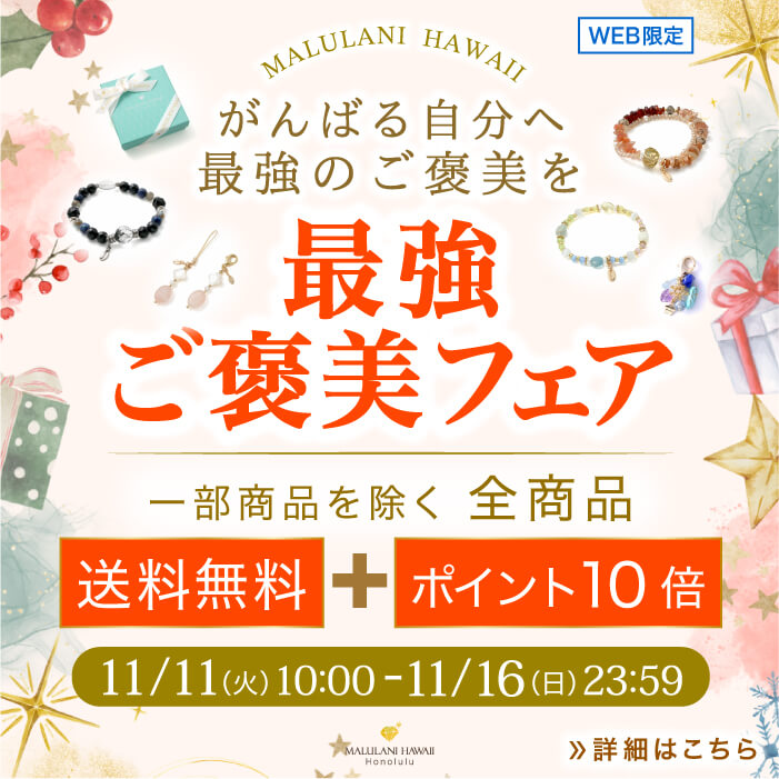 パワーストーンとは、天然石・アクセサリー・スピリチュアル要素など多彩な文脈で語られる存在です。特にブレスレット、ストラップ、リング、ピアス、ネックレスなどのアクセサリー関連語と強く結びつき、お守り、開運、恋愛運、金運、健康運、仕事運などの運気アップ・願望成就のキーワードと共に使われる傾向があります。 また、水晶、クォーツ、アメジスト、ローズクォーツ、オニキス、タイガーアイ、トルマリンなどの代表的な石名や、ラピスラズリ、インカローズ、ラリマー、ムーンストーン、サファイアなどの高品質・希少石との共起頻度も高く、意味、効果、浄化、ヒーリング、エネルギー、象徴などのスピリチュアル用語と並んで登場します。 "パワーストーン(天然石)は、古来より人々に「お守り」として親しまれ、アクセサリーやインテリア、ヒーリングアイテムなど多彩な形で活用されてきました。ブレスレット(ブレス)やネックレス、リング、ピアス、ストラップ、ペンダント、アンクレット、チャームなどのアクセサリーから、原石・クリスタル(クォーツ)ポイント・クラスター・さざれ石・タンブル・セージなどの浄化用アイテムまで、幅広く取り揃えています。 代表的な水晶(クリスタル/クォーツ)は浄化や願望成就の象徴とされ、アメジスト、ローズクォーツ、インカローズ、ラピスラズリ、ターコイズ、ムーンストーン、アクアマリン、エメラルド、ルビー、サファイア、ガーネットなど、誕生石としても人気の高い石々が並びます。 また、シトリン、ルチルクォーツ、タイガーアイは金運・財運・仕事運の上昇に、モリオン(黒水晶)・オニキス・天眼石は厄除け・魔除け・邪気払いの強力な守護石として知られています。恋愛運アップを願うならモルガナイト、ピンクトルマリン、ロードナイト、ストロベリークォーツ、クンツァイトなどの石が心を癒し、愛と調和をもたらします。 さらに、ペリドット、サンストーン、ラリマー、ラブラドライト、アイオライト、アマゾナイト、クリソコラ、クリソプレーズ、ブルーレースアゲートなどは、家庭円満・健康運・子宝運を支える石として注目されています。ラリマー、スギライト、チャロアイトは「世界三大ヒーリングストーン」と呼ばれ、心身の浄化とエネルギーバランスの調整を助けるヒーリングストーンです。 パワーストーンとは、天然石・アクセサリー・スピリチュアル要素が融合した存在であり、開運・恋愛運・金運・健康運・仕事運など、人生のさまざまな願いをサポートします。 代表的な石としては、水晶、アメジスト、ローズクォーツ、タイガーアイ、トルマリン、ラピスラズリ、ラブラドライト、インカローズ、ムーンストーン、オパール、サファイア、エメラルド、ルビー、ガーネットなどが挙げられ、さらにフローライト、チャロアイト、モリオン、スモーキークォーツ、クンツァイト、アイオライト、ペリドットなども人気を集めています。産地や品質によっても価値が異なり、ブラジル産やチベット産の高品質ストーンは特に高い評価を得ています。 天然石とは、地球が長い年月をかけて育んだ美とエネルギーの結晶。その自然の波動が「癒し」「浄化」「再生」「エネルギー調整」といったスピリチュアルな効果をもたらすとされます。アクセサリーとして身につけるだけでなく、インテリアや瞑想、風水のアイテムとしても人気です。誕生石・守護石・チャクラ対応の石を選ぶことで、自分に合った運気アップを叶えることができます。 マルラニハワイでは、世界中から厳選した高品質なパワーストーンと天然石を取り扱っています。定番の水晶、アメジスト、ラピスラズリ、翡翠、ターコイズ、オニキス、エメラルド、ルビーに加え、フローライト、アパタイト、アベンチュリン、マラカイト、アラゴナイト、アメトリン、カイヤナイト、ハウライトなど、多彩なカラーと輝きを持つストーンを豊富にラインアップ。すべての石は事前に浄化済みで、安心してご使用いただけます。 オンラインショップでは、誕生石・目的別・カラー別の検索機能が充実し、開運・恋愛・金運・健康・仕事運・守護石など、願いごとに合わせたアクセサリー選びが可能。 オーダーメイドブレスレットは自分だけのお守りとして人気で、誕生日・記念日のギフトにも最適です。送料無料・ポイント還元・ギフト包装・刻印サービスなどもあり、特別な贈り物にもぴったり。 また、セージ・さざれ・クラスター・太陽光・月光浴など、石に合わせた浄化方法も詳しくご案内しています。カラーで選ぶ楽しみもあり、ブルー・ピンク・グリーン・イエロー・レッド・ブラック・ホワイト・レインボーといった印象に合わせて、今の自分に寄り添う石を見つけることができます。 パワーストーンは、単なるアクセサリーではなく、精神を穏やかに整え、人生に輝きと成功をもたらすヒーリングパートナー。 マルラニハワイの天然石アク