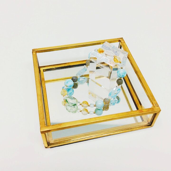 ラリマーやグリーンアメジストなど癒しをベースとしたお石の中に、財運・厄除け・仕事運を高めるゴールデンルチルクォーツとブルートパーズを組み合わせた仕事もプライベートもどっちも120%楽しみたい方のお守りブレスレットに