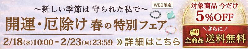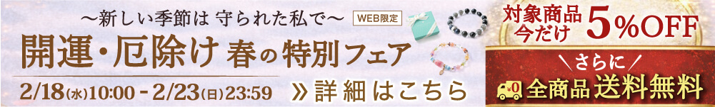 2月18日(水)10:00 〜 2月23日(日)23:59限定、オンラインショップで開運・厄除け商品が5%OFF+送料無料のキャンペーンを実施いたします。